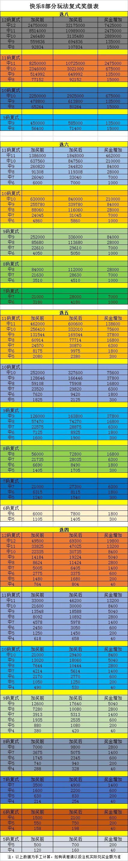 本次快乐8游戏派奖所有玩法都参与,但并不是所有奖等参与派奖,我们手工整理了部分比较受欢迎的玩法,测算了其复式、胆拖的派奖后奖金。因能力有限,奖金仅供参考,实际奖金以投注机显示为准。在具体运用方面,可以利用派奖后奖金的变化,找到更好的玩法组合,冲击大奖、巨奖。